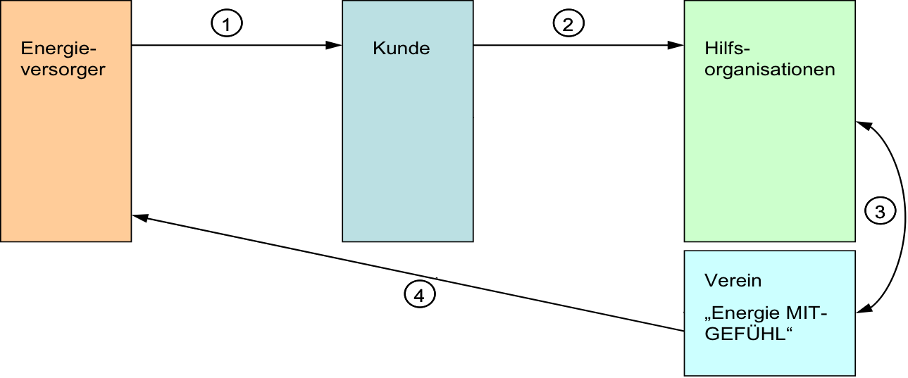 Falls die Einstellung der Energielieferung angedroht wird bzw. die Versorgungsunterbrechung bereits eingetreten ist, wendet sich der Kunde i.A. an eine Hilfsorganisation (z.B. Caritas oder Schuldnerberatung) - diese Hilfsorganisation(en) unterstützen die Kunden in möglichst umfassender Weise. Für eine etwaige Unterstützung bzgl. der Energieversorgung können die Hilfsorganisationen die Kunden an den Verein "Energie MIT-GEFÜHL" vermitteln. - Schritt 3: